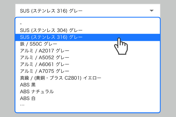 ステンレス・アルミなどの金属からABS・ガラス繊維入り樹脂材まで、30種類以上の豊富な材料からお選びいただけます。