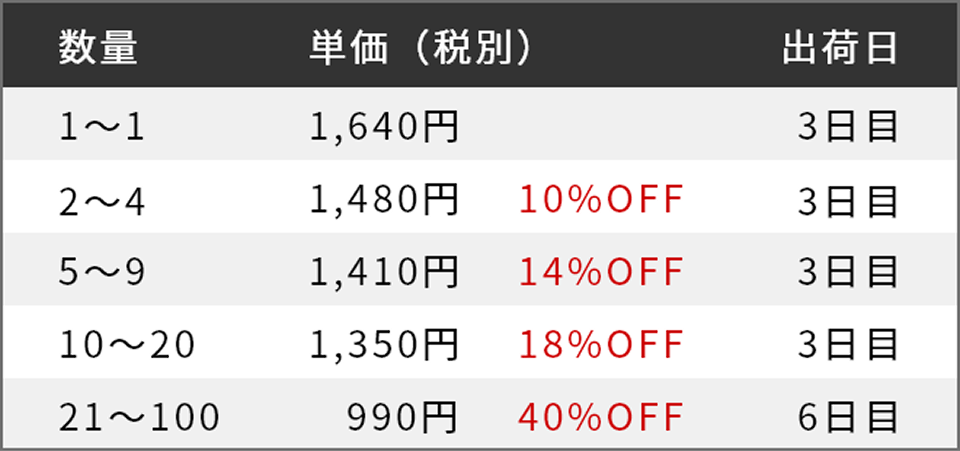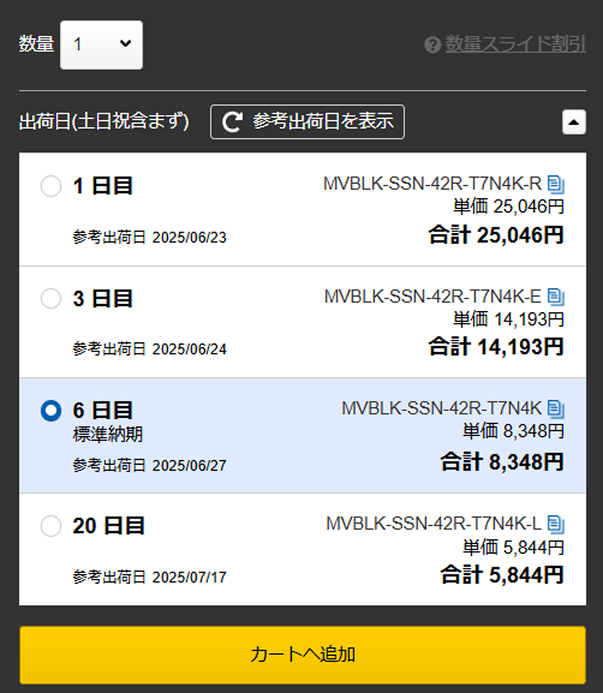 最短1日目出荷の短納期~コストダウン可能な長納期まで、出荷日を選択できます。