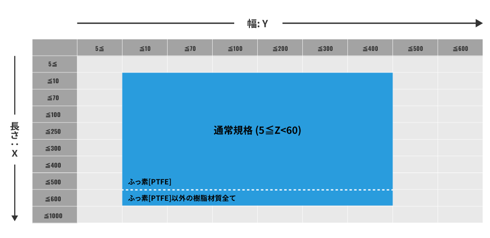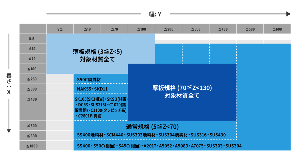 厚み(Z)3≦Z<5(薄板) 長さ(X)5≦X≦100 幅(Y) 5≦X≦100