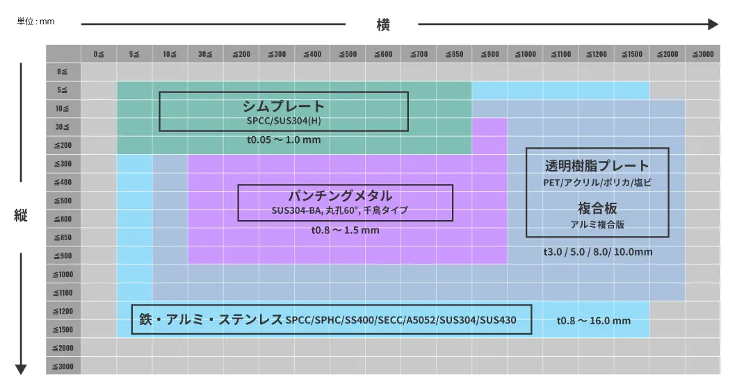 板金加工で対応している材質と外形寸法の一覧です。多様なサイズに幅広く対応。